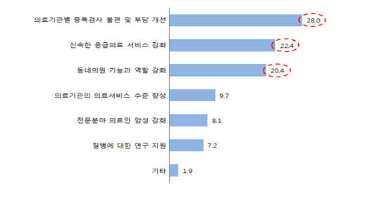 '의료기관별 중복검사 불편 및 부담 개선(28.0%)','신속한 응급의료 서비스 강화(22.4%)', '동네의원 기능과 역할 강화(20.4%)'순으로 중요성이 평가됐다.