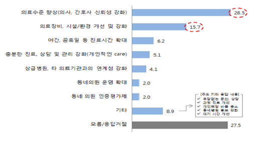 동네의원 신뢰와 이용편리성 개선을 위한 방안으로는 '의료수준의 향상(의사, 간호사 신뢰성 강화)', '의료장비, 시설/환경의 개선 및 강화'가 각각 28.5%, 15.7%로 가장 높게 나타났다.
