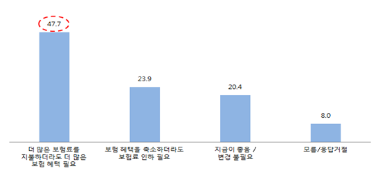 한편 국민의 47.7%는 '더 많은 보험료를 지불하더라도 더 많은 보험 혜택이 필요'하다고 응답했고, 23.9%는 '보험 혜택을 축소하더라도 보험료 인하가 필요'하다고 응답했다. 20.4%는 '지금이 좋고 변경이 필요없다'고 답했다.