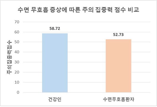 고대 안산병원 수면장애센터 신철 교수팀은 "수면 무호흡증 환자군과 정상군을 비교한 결과, 수면 무호흡증 환자군이 정상군보다 주의 집중력 점수가 낮았다"면서 "또 수면 무호흡 증상이 있는 사람에서 주간 졸림증 위험이 1.7배 높았다"고 밝혔다.
