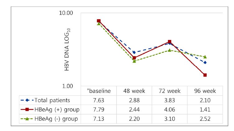 HBe 항원 양성군과 음성군에서는 치료 48주에 HBV DNA log10 값이 각각 2.44, 2.20이었으며 96주에는 1.41와 2.52로 추적 기간에 따른 차이가 없었다.
