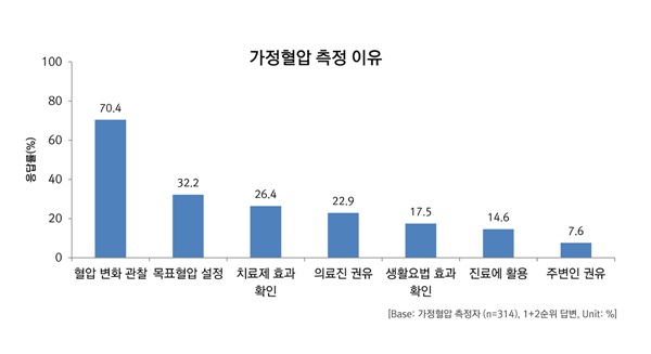 가정혈압을 측정한다고 답한 환자의 주된 측정 이유는 △혈압 변화를 살펴볼 수 있기 때문(70.4%, 1, 2순위 복수 응답) △혈압 조절 목표를 세우는 데 도움이 돼서(32.2%) △치료제 복용 효과를 확인할 수 있어서(26.4%) △의료진의 권유(22.9%) 등이 순을 이었다.