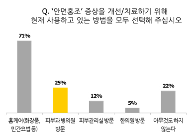 환자들의 낮은 질환 이해도는 피부과 치료 대신 비전문적인 홈케어로 이어져 질환의 악화 가능성을 높이고 있는 것으로 조사되었다. 안면홍조의 치료 및 관리법으로 환자의 71%는 ‘화장품, 민간요법 등의 홈케어’라고 응답했고, ‘피부과 병의원 방문’은 25%에 불과했다.