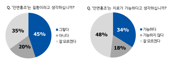 안면홍조 환자 700명을 대상으로도 설문조사를 실시했다. 그 결과 안면홍조를 질환으로 인지하고 있는 환자는 45%로 절반에도 못 미치는 것으로 나타났다.