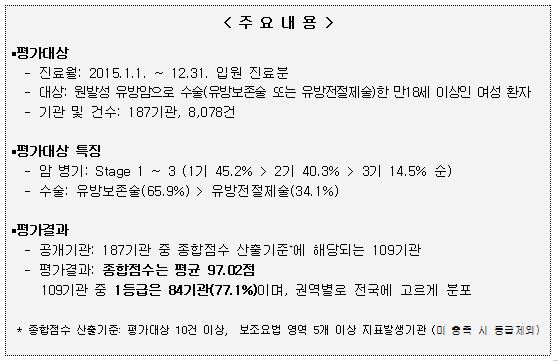 이번 평가는 2015년 1월부터 12월까지 원발성 유방암으로 수술(유방보존술 또는 유방전절제술)한 만 18세 이상의 여성을 대상으로 실시됐다.
