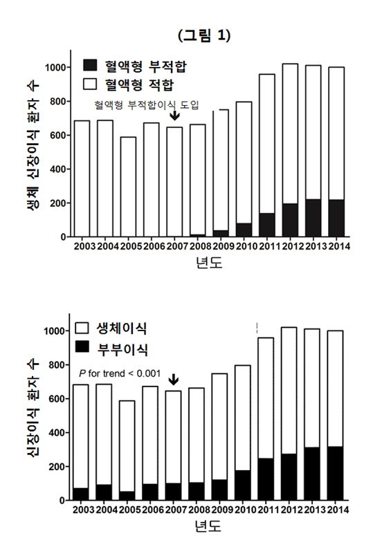 혈액형 부적합 이식 비율은 부적합 이식을 도입한 2007년에는 0.3%였으나, 2014년에 21.7%로 증가했다. 부부이식은 2003년 전체 생체신장이식의 10%였으나 혈액형 부적합 이식이후 매년 급속도로 증가해 2014년 31.5%까지 증가했다.(그림1).