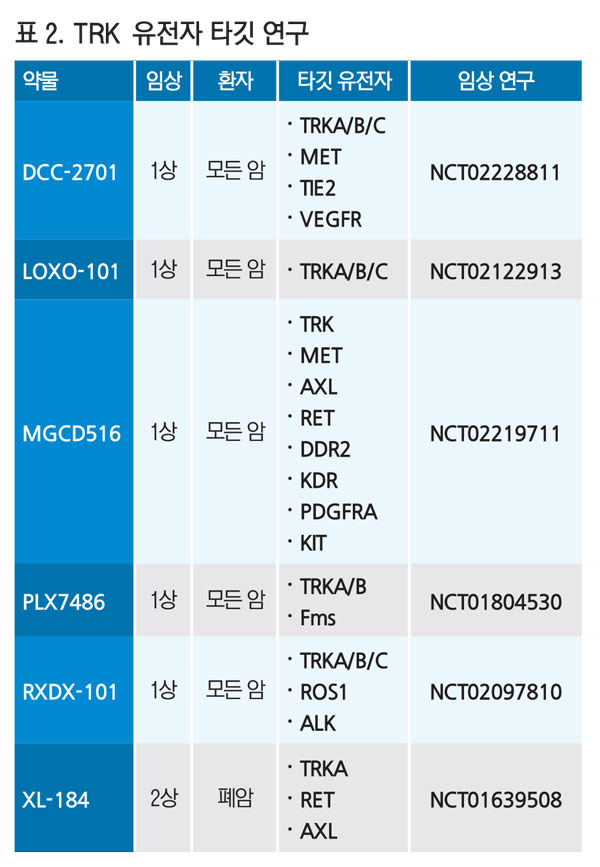 DCC-2701, LOXO-101, MGCD516, PLX7486 등의 후보물질은 TRK, MET, RET 등의 유전자 양성환자를 대상으로 1상을 진행하고 있으며, RXDX-101, XL-164는 TRK, ROS1, ALK 양성인 폐암 환자를 대상으로 2상을 진행 중이다<표 2>.
