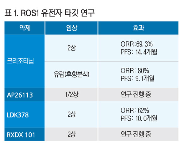 이런 가능성 때문에 치료제 개발은 계속되고 있다. 후보물질인 AP26113, LDK378, RXDX 101이 ROS1 양성 폐암 환자를 대상으로 임상을 진행 중이다<표 1>.