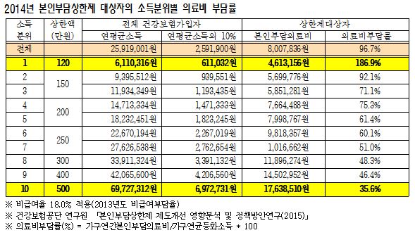본인부담상한제 상한기준을 가입자의 연소득에 비례하는 방식으로 변경하자는 제안이 나왔다. 소득순위별 상한액을 연 평균 소득의 10% 수준으로 재설정, 저소득층의 의료비 부담을 낮춘다는 제도의 취지를 살리자는 의미다.