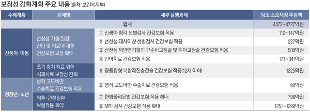 선천성 기형 및 신생아 의료지원 확대 방안으로는 신생아 청각 선별검사 및 선천성 대사이상 선별검사 급여확대, 언어치료 건강보험 적용, 선천성 악안면 기형의 구순비 교정술 및 치아교정 건강보험 적용 등을 각각 추진한다. 이에 소요되는 예산은 1008~1215억원 수준으로 추계됐다.