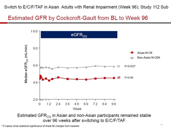 이번에 공개된 연구는 E/C/F/TAF의 대표 연구인 112 연구의 호스트 혹(후향적 관찰) 분석으로, 사구체여과율(eGFR)이 30~69mL/min 범위에 속하면서 HIV-1 RNA가 6개월 이상 50copies/uL 미만으로 확인된 242명을 분석한 것이다.