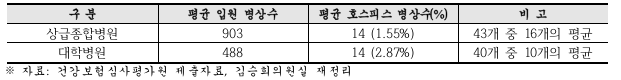 이들 병원이 운영 중인 호스피스 병상은 총 217병상, 1개 기관 평균 병상 수는 14병상이다. 이들 병원의 평균 입원 병상 수가 903병상이라는 점을 감안하면, 전체 병상 대비 호스피스 병상의 비율은 1.55%에 그친다