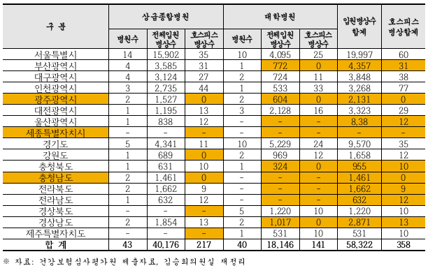 상황이 이렇다보니 광주와 세종, 충남 등 일부지역의 경우, 지역 내 상급종합병원과 종합병원 어디에도 호스피스 병상이 없는 상황이다.
