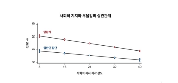 암 환자의 경우 사회적 지지 정도가 낮을수록 우울감이 심해지는 정도가 일반인들보다 더 가파른 것으로 나타났다.
