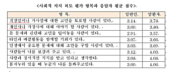 연구팀은 이들 환자와 일반인을 대상으로 '힘든일이 있을 때 솔직히 상의할 사람이 있다' '주변 사람들로부터 사랑 받는다고 느낀다' 등의 사회적 지지 정도를 물었다.