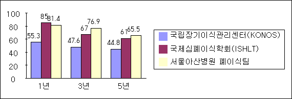 서울아산병원 폐이식팀(박승일·김동관·심태선·홍상범 교수)이 2008년부터 지난 해 말까지 폐이식을 받은 환자 5년 생존율을 발표했다.