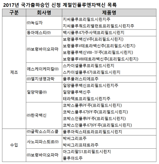 식품의약품안전처(처장 류영진) 식품의약품안전평가원은 2017년 계절인플루엔자백신(독감백신)의 국가출하승인 현황정보를 제공한다고 밝혔다.