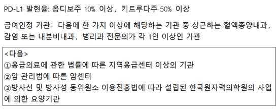 개정안에 따르면, 옵디보와 키트루다는 각각 PD-L1 10%, 50% 이상인 비소세포폐암 환자를 대상으로 보험이 인정된다.