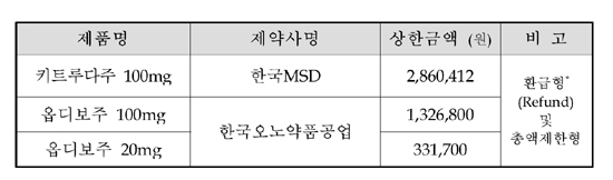 건강보험정책심의위원회는 18일 MSD의 키트루다10mg과 오노약품공업의 옵디보100mg·20mg 등 3개 품목에 대해 환급형 및 총액제한형식으로 위험분담제 적용을 결정했다.