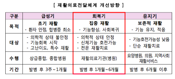 실종된 '회복기' 재활의료 인프라를 확충해, 급성기-회복기-유지기-사회복귀로 이어지는 재활의료체계를 만든다는 목표다.