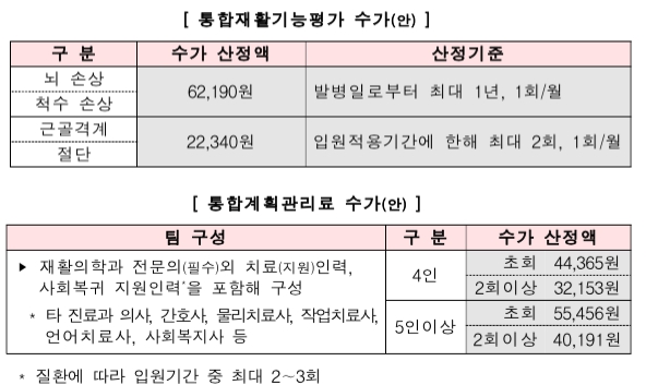 먼저 치료성과 평가에 참여하고, 거기서 일정 수준 이상의 성과가 확인된 기관에 대해서는 뇌와 척수질환의 경우 6만 2190원, 근골격계 질환의 경우 2만 2340원의 '통합재활기능평가 수가'를 지급한다.
