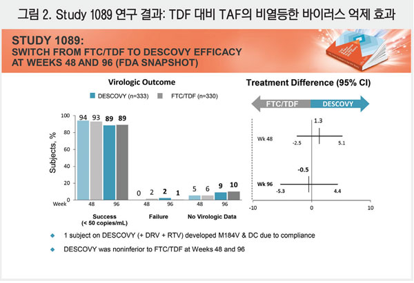 또한, 96주차에서의 바이러스 억제 효과는 지속적으로 FTC/TDF를 복용한 군과 FTC/TAF로 변경한 군에서 모두 유사하게 89%였고 실패율은 모두 낮았다. 바이러스 억제 효과를 알 수 없는 환자 비율도 두 군에서 모두 유사했다. 그러나 두 군에서의 바이러스 억제 효과는 모두 높았다.