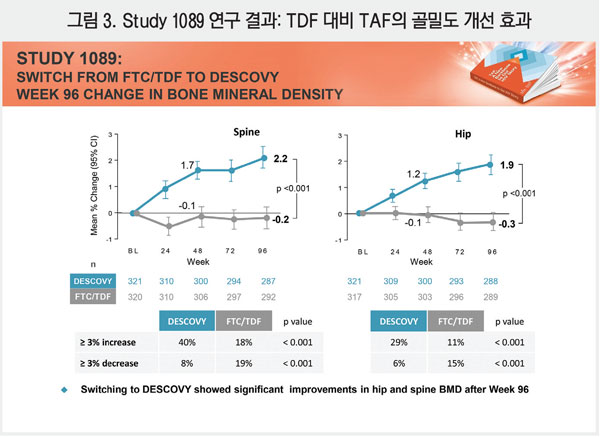 96주차에 두 군 모두 약물 중단 사례는 매우 적었으나 지속적으로 FTC/TDF를 복용했던 환자들에서 신장 세뇨관 질환으로 약물을 중단한 사례가 1건 발생했다. 그리고 제3제 복용 여부에 관계없이 FTC/TDF에서 FTC/TAF로 변경한 후 eGFR을 비롯한 UPCR, UACR, RBP (retinol-binding protein):크레아티닌 비율, β2-microglobulin:크레아티닌 비율 등 모든 신장 관련 수치들이 개선됐다. FTC/TDF에서 FTC/TAF로 변경함으로써 96주차의 골반 및 척추 골밀도가 향상됐다<그림 3>.