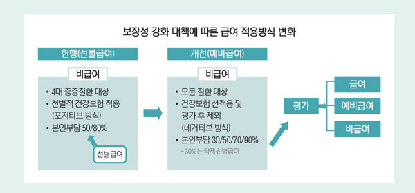 이를 위한 주요 방안은 △비급여 항목의 급여화 △취약계층 중심의 개인 의료비 부담 상한액 적정 관리 △긴급 위기 상황 지원 강화 등이다. 이들 중 제약 및 의료기기산업과 가장 밀접한 관련이 있는 방안은 비급여 항목의 급여화 부분이다.