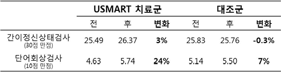 치매검진 도구로 사용되는 '간이정신상태검사(MMSE)'를 통해 인지기능을 평가해 보니, USMART 프로그램을 시행한 치료군은 점수가 약 0.9점 증가한 반면 대조군은 오히려 0.1점 감소했고, '단어목록회상검사(WLRT)'의 경우 치료군은 프로그램 실시 전에 비해 점수가 24% 상승했지만 대조군은 7% 상승에 그쳐 USMART 프로그램의 우수성이 입증됐다.
