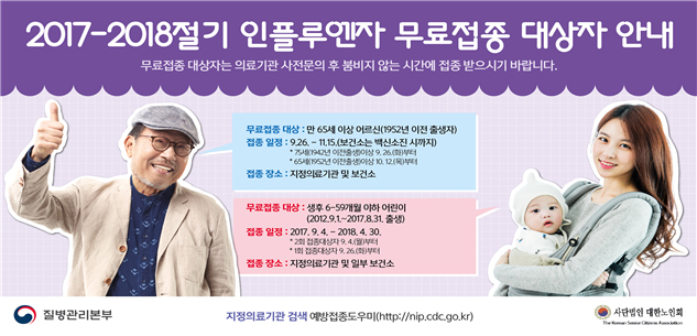 한편 무료접종 관련 상담은 관할 보건소, 질병관리본부 콜센터(☎1339) 및 보건복지콜센터(☎129)로 문의하고, 지정의료기관은 예방접종 도우미 홈페이지 및 스마트폰 앱에서도 확인할 수 있다. 추석연휴기간 동안 접종 가능한 의료기관도 26일부터 확인 가능하다.