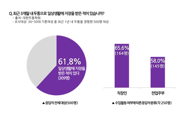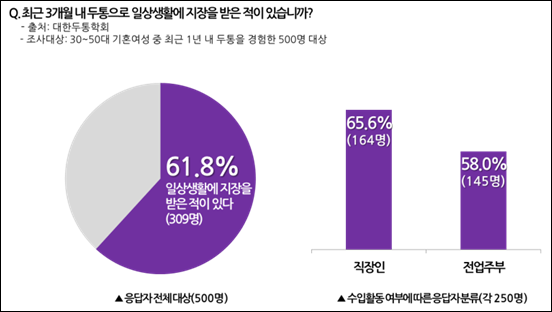 직업 유무에 따라서는 수입활동과 가사를 병행하는 직장인 250명 중 164명(65.6%), 전업주부 250명 중 145명(58%)이 두통으로 일상생활에 지장을 겪었다. 일상생활에 지장이 생긴 빈도는 직장인이 3.6일, 전업주부가 3.2일로, 직장인이 0.4일 더 많았다.