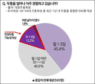 대한두통학회(회장 김병건)가 시장조사 전문기업 마크로밀엠브레인과 30~50대 기혼여성 500명을 대상으로 설문조사한 결과, 61.8%가 최근 3개월 내 두통으로 인해 업무나 가사 등 일상생활에 지장을 받은 적 있다고 답했다. 게다가 두통으로 일상생활에 지장을 받은 날은 평균 3.4일인 것으로 나타났다.