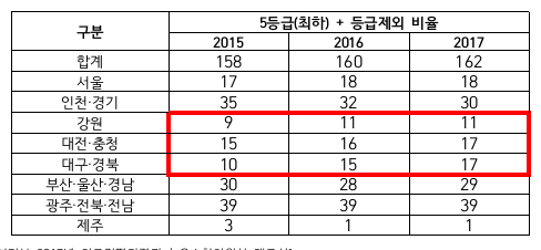 실제 서울, 인천‧경기 지역 소재 병원 가운데 최하등급이나 등급제외를 받은 병원의 비율은 각각 32%와 41%에 그쳤으나, 수도권을 제외한 전국 모든 지역은 50%를 넘었다.