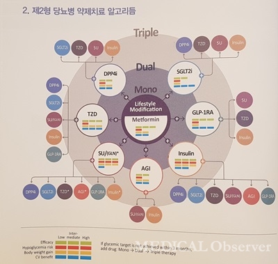 이에 제2형 당뇨병 약제치료 알고리듬을 평면적으로 배열하지 않고 그래프화해 제시했다. 아울러 약제별 혈당강하 효능, 저혈당 위험, 체중 증가, 심혈관질환 위험 등의 특징을 막대 그래프로 나타내, 미국당뇨병학회(ADA) 및 미국임상내분비학회(AACE) 가이드라인과 차이를 뒀다.