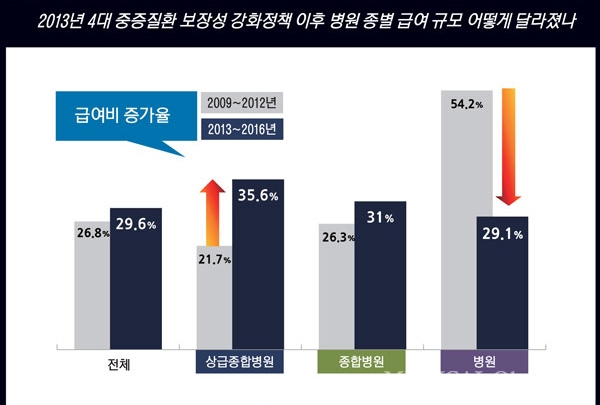 실제 2009~2012년 상급병원 급여비 매출 증가율은 21.7%로 전체 의료기관 평균 매출 증가율(26.8%)보다 낮았다. 같은 기간 종합병원의 급여 매출은 26.3%, 병원의 급여 매출 규모는 54.2%가 증가했다.