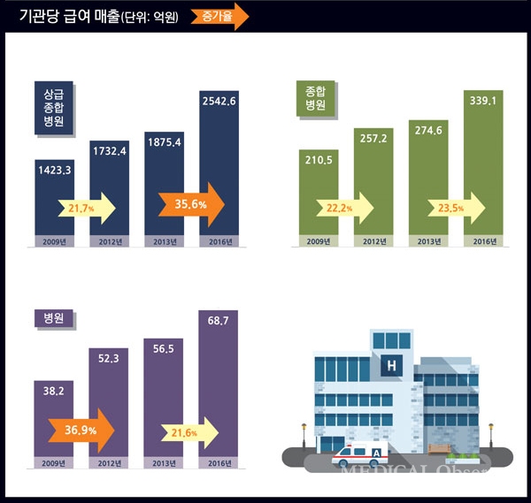 2013~2016년 기관당 연 평균 급여비 매출 증가율은 상급병원 35.6%, 종합병원 23.5%, 병원 21.6%를 기록했다. 2013년과 2016년 각 종별 급여 매출은 상급병원 1875억 4000만원→2542억 6000만원, 종합병원 274억 6000만원→339억 1000만원, 병원 56억 5000만원→68억 7000만원을 각각 기록했다.