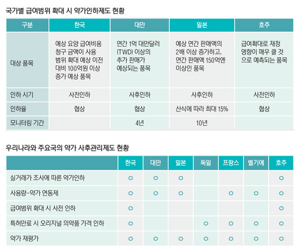 반면 호주는 급여범위 확대로 인해 재정영향이 매우 클 것으로 예측되는 의약품에 대해 협상을 통해 약가를 사전에 인하하고 있다.