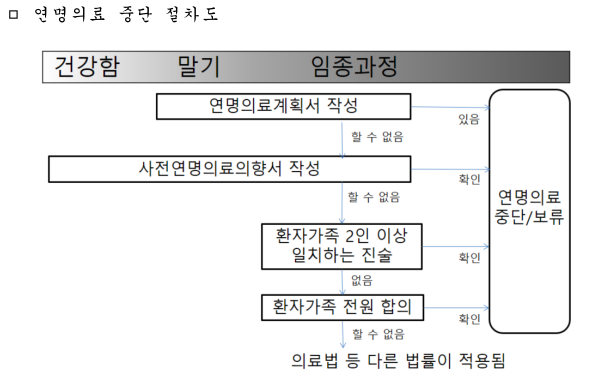 연명의료 중단은 원칙적으로 환자 본인이 직접 사전연명의료의향서 또는 연명의료계획서를 통해 연명의료를 원치 않는다는 분명한 의사를 표명한 경우에 한한다.