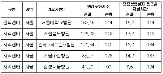 1일 보건복지부가 국회 보건복지위원회 김상훈 의원(자유한국당)에게 제출한 ‘2016년 응급의료기관 평가’에 따르면, 주요지표인 ▲병상포화지수 및 ▲중증상병환자 전체 응급실 재실시간 부문에서 ‘빅5병원’이 모두 하위권에 머무른 것으로 나타났다.