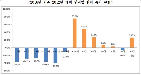 실제 18세 이하 아동과 청소년의 경우 지난 5년간 환자 숫자가 31.2% 감소했으나, 19~29세 환자는 75.2%가 급증했다. 아울러 30대 48.2%, 40대 27.1%에서도 환자의 숫자가 늘어났다.