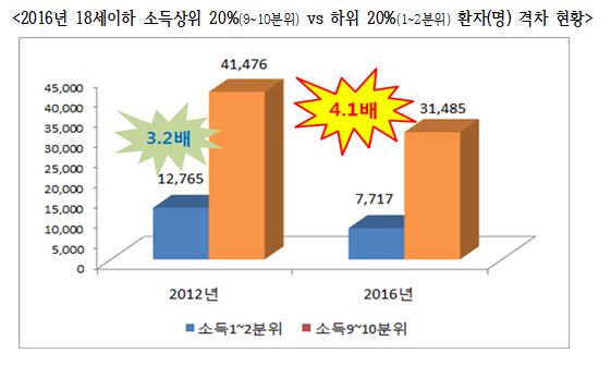 청소년 층에서는 환자 숫자가 줄어들고 있는 것으로 파악됐는데, 소득수준별로 병원 이용에 차이를 보였다. 소득상위 20%(소득분위 9~10분위)에서 하위 20%(소득분위 1~2분위) 보다 환자가 무려 4.1배가 많은 것으로 나타난 것.