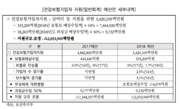 그러나 정부는 관련법령 규정에 따라 내년 건강보험가입자 지원사업 일반예산의 규모를 7조 4649억원으로 산정해놓고도, '지원규모 조정'을 통해 2조 539억원을 감액한 5조 4201억원만을 내년도 예산에 반영했다.