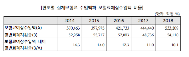 이전에는 보험료예상수입액을 과소추계하고 과소지원하는 방식으로 그나마 예산편성시에는 14%의 국고지원 비율을 맞췄지만, 지원규모 조정방식이 도입된 이후에는 아예 예산안 편성시부터 지원예산을 감액조정해 국고지원 충족률이 더 떨어지는 추세다.