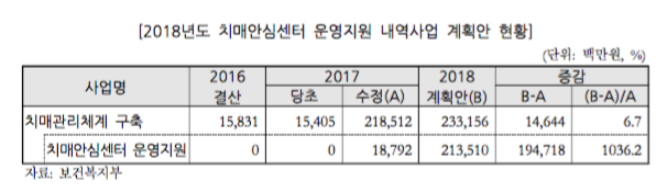 정부는 국정과제 중 하나인 치매국가책임제 이행을 위해, 내년 치매관리체계 구축사업 예산을 올해 본예산 대비 2177억 5100만원(1413.5%), 추경대비 146억 4400만원(6.7%) 증액한 2331억 5600억원으로 편성했다.