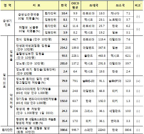 일단 급성기 진료 영역의 질을 반영하는 대표적인 지표인 뇌졸중과 급성심근경색증 30일 치명률을 보면, 우리나라 45세 이상 허혈성 뇌졸중 입원 환자의 30일 치명률은 3.9%로 OECD 회원국 평균(8.2%)이 비해 양호한 것으로 집계됐다.