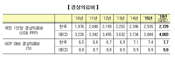 실제 보건의료 부문 서비스 및 재화에 소비된 국민 전체의 1년간 지출 총액을 의미하는 우리나라의 국민 1인당 경상의료비는 2729 US$PPP로 OECD 평균(4003 US$PPP)보다 낮았으며, GDP 대비 경상의료비 지출 규모(7.7%)도 OECD 회원국 평균(9.0%)보다 적었다.