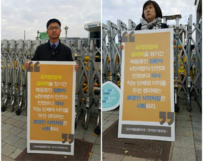 한국백혈병환우회와 한국GIST환우회(이하 환자단체)는 류영진 처장의 사퇴를 촉구하며 1인 시위에 나섰다.