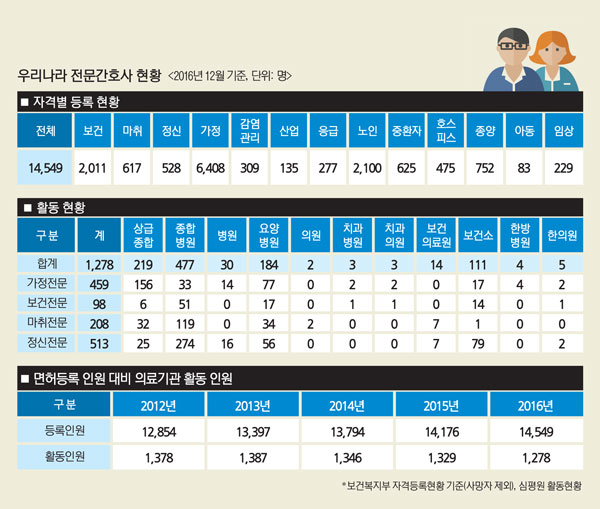 2016년 기준 전체 전문간호사 자격 취득자는 1만 4549명이다.