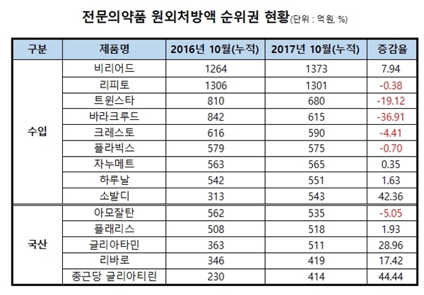 이어 MSD 당뇨병 치료제 자누메트(565억원), 아스텔라스 전립선비대증 치료제 하루날(551억원), 길리어드 C형간염 치료제 소발디(543억원) 등이 1위부터 9위 자리를 차지했다.