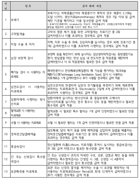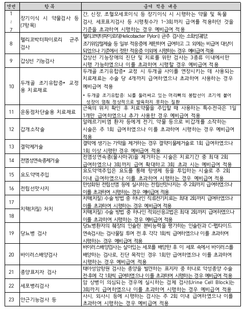정부는 일단 남용가능성이 낮다고 판단된 고막절개술과 암환자 방사선 치료 등 13개 항목은 기준 자체를 없애 필요한 만큼 환자가 이용할 수 있도록 '필수급여'로 전면 전환하겠다고 밝혔다.